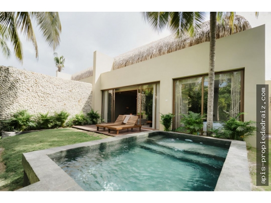 La villa mediana cuenta con dos habitaciones en 105m2 interiores, al igual que 56m2 de terraza exterior privada con una pequeña piscina y un jardín de plantas nativas y tropicales. Esta villa se distribuye en dos niveles. En el primero, se encuentra la zona social, cocina, terraza con piscina y la alcoba de invitados con su baño completo. En el segundo está la habitación principal con baño, closet y terraza privada